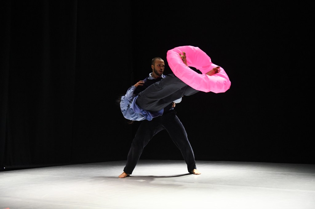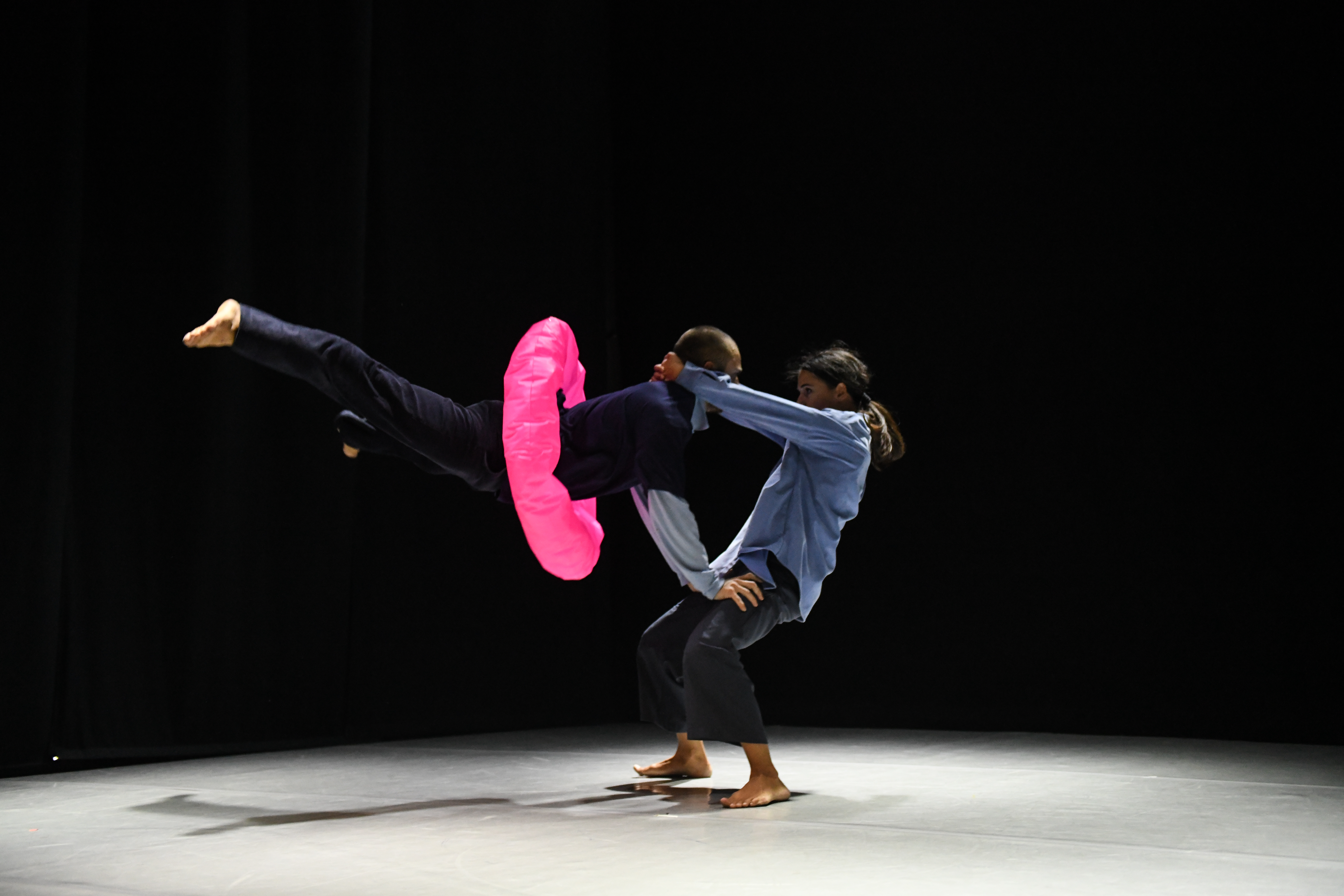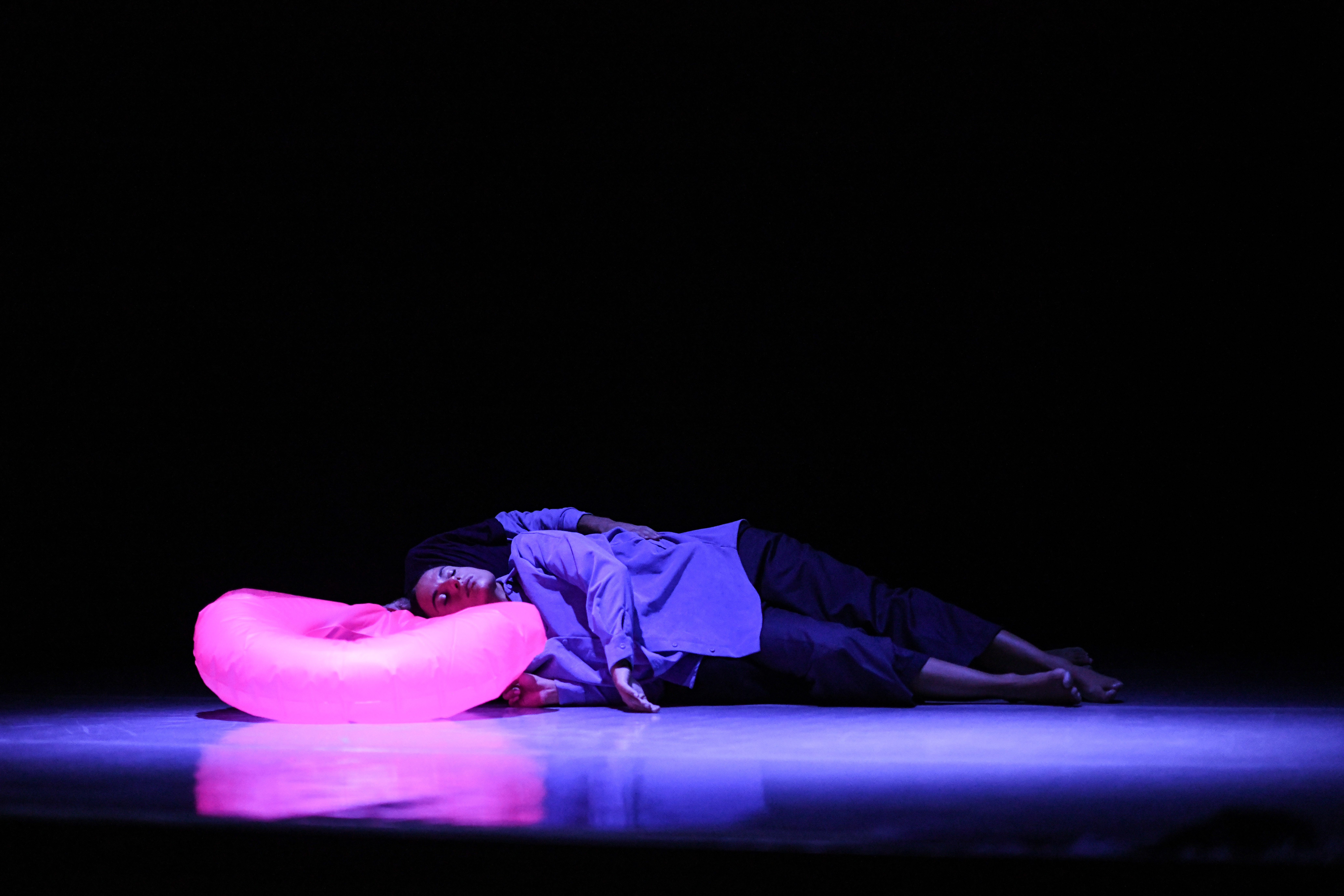 La scena silenziosa è abitata da due corpi inerti che, esausti, tentano azioni, come gonfiare un salvagente. I danzatori, quasi liquefatti al suolo, lentamente si interrogano sulle possibili soluzioni utili per riuscire a riemergere da quel “buco” che li ha inghiottiti.