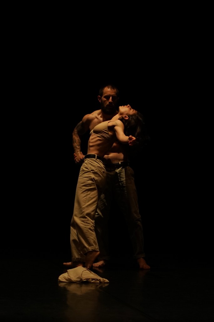 Il nostro intento è stato quello di rielaborare coreograficamente attraverso la nostra fisicità la cacciata dei due corpi dal Paradiso ed il fatto che si ritrovano catapultati in una nuova terra, in uno spazio ostile e profano. Due corpi che accettano la loro condizione terrena, fatta di forza e di grande fragilità, senza però dimenticare quell’appartenenza divina. A partire da una forza di gravità che costringe i due essere umani ad allacciarsi l’uno sull’altra, arrivano infine a dei virtuosismi verticali che non possono però che precipitare verso il pavimento. Il tutto avviene attraverso una struttura semplice e diretta che possa mettere in luce la sensazione che i due corpi stanno