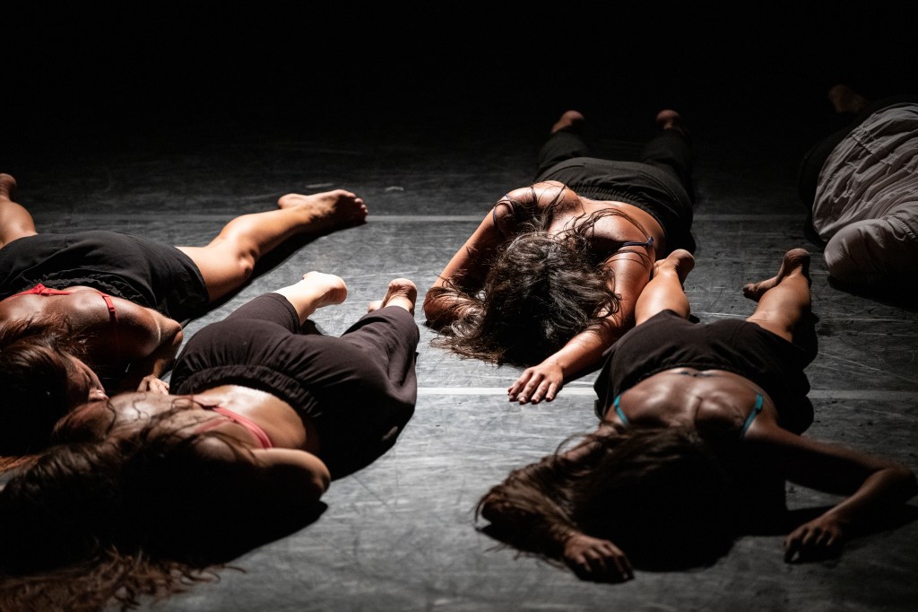 ALGOS | 400 millimetri dopo prova a scrutare dalla penombra il tema complesso di convivere con la sofferenza, ispirandosi all’evento drammatico dell’alluvione avvenuta nella città di Senigallia nel 2022. I danzatori, quasi liquefatti al suolo si interrogano sulle possibili soluzioni utili per riuscire a riemergere da quel “buco” che li ha inghiottiti. Si intrecciano, si incastrano, si aggrovigliano partorendo così un “trio”, frutto di plastica, carne e respiro. Un vulnerabile sistema di sostentamento reciproco nel quale i tre elementi sono un l’appendice degli altri, sono uno la salvezza degli altri.